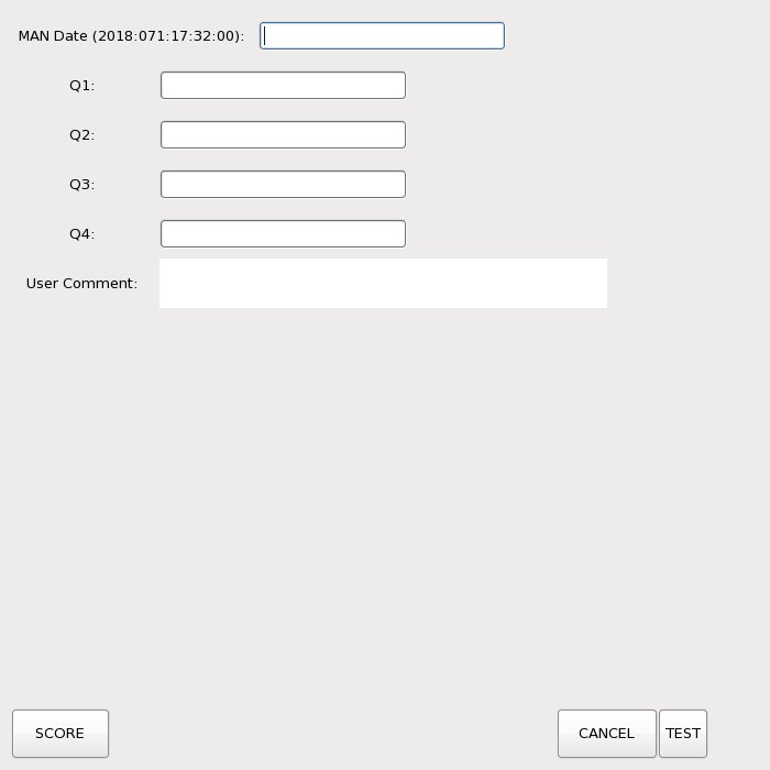 When all fields are filled in, Click the SCORE buttons to record the data in the active Tracking file. If you click "TEST", it will record the information in the test tracking file which you specify.
