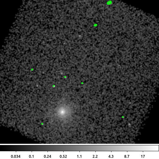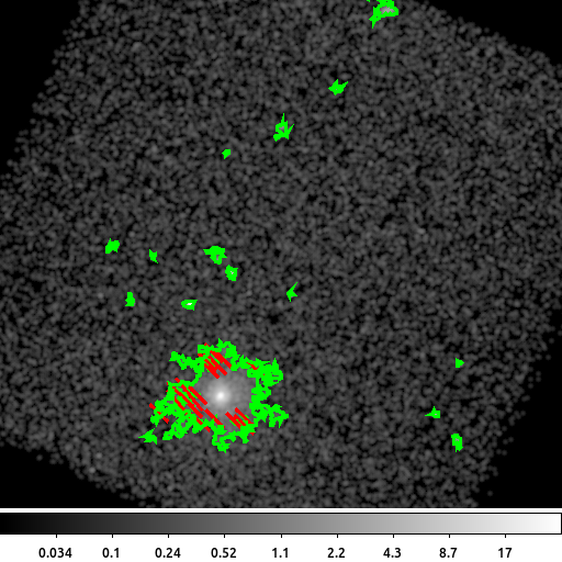 Finally, dmimgblob is used to identify groups of pixels above the threshold. In this example, we selected thresh=0.1 which is 0.1 counts/pixel above the estimated background.