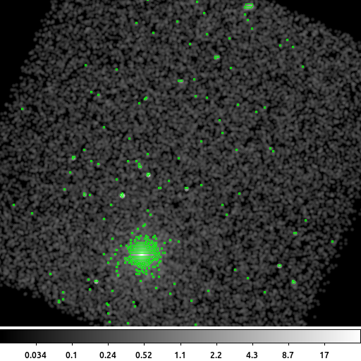 -cmap grey -smooth -mask mark range -mask range 0.1 9999 -mask color green -mask transparency 10 -mask blobs.img -frame 1 -view colorbar yesFirst, the input image is smoothed with a 3-pixel Gaussian using aconvolve. This not only suppresses noise, but also works as a matched-filter. We only need to remember that convolution and correlation are the same when working with real-valued, symmetrical convolution kernels. Instead of thinking of this as a smoothed image, we can also accurately describe this aconvolve output as the correlation of the input with a 3-pixel Gaussian which emphasizes sources at that same spatial extent.