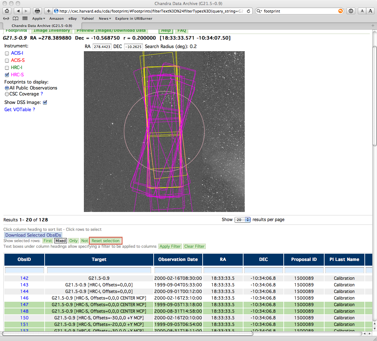First we start by turning off the display for all but the HRC-S detector, leaving only the pink outlines. Clicking on one of the outlines will select it (and in fact any other observation that covers that point on the sky); the selected observations are drawn in a yellow outline and are highlighted with a green background in the table. An example is shown in Figure 9.