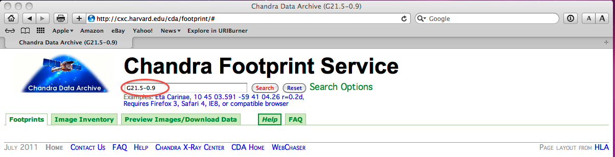 Figure 6: Starting a search for G21.5-0.9 with the Chandra Footprint Service