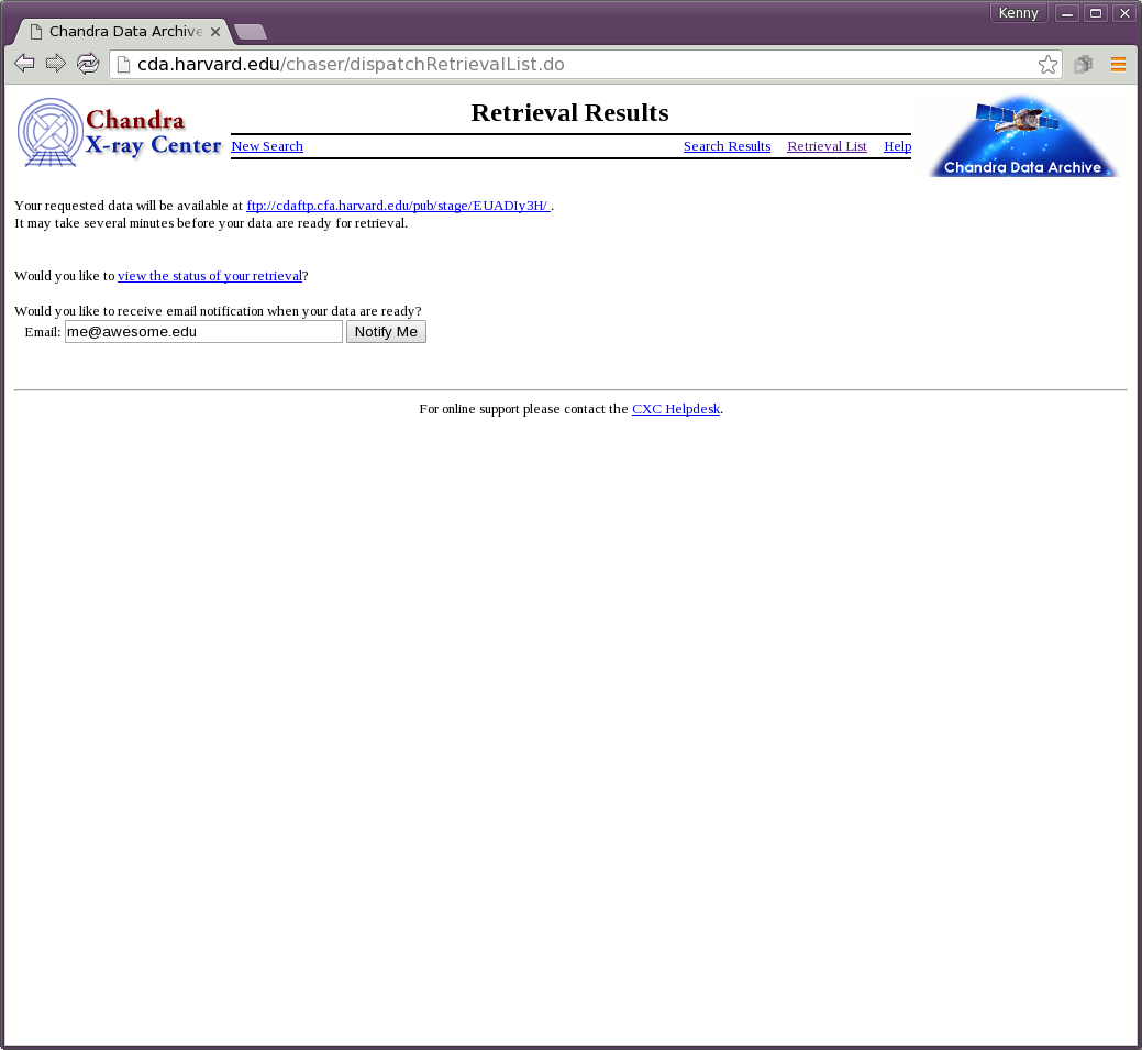The files are compiled into a tarred package which is placed onto the archive web server (cdaftp.harvard.edu). If you provide your email address, you will receive an email when the tarfile is ready for download: