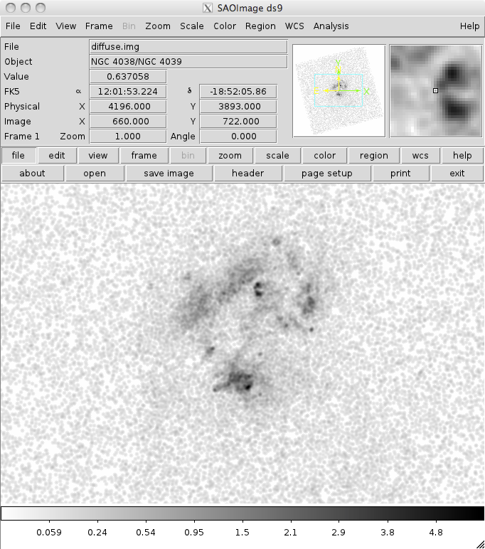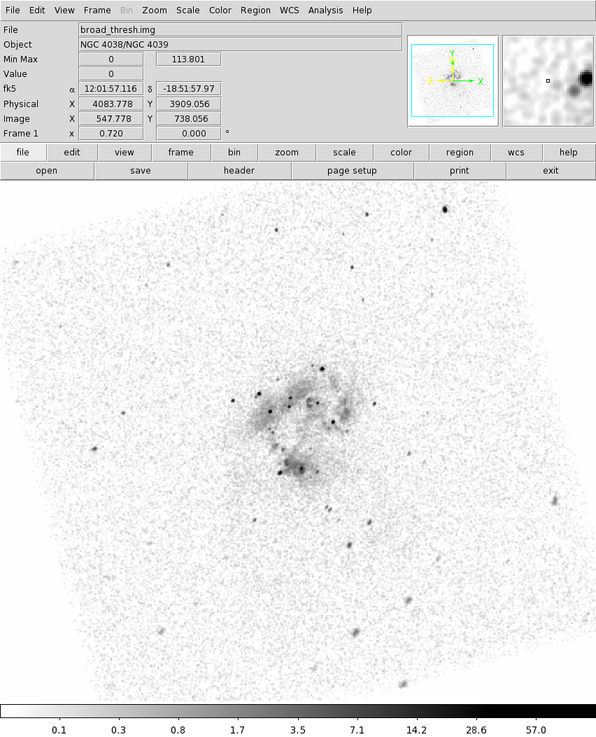 unix% ds9 images/broad_thresh.img -scale log -zoom 0.5 -smooth -invert