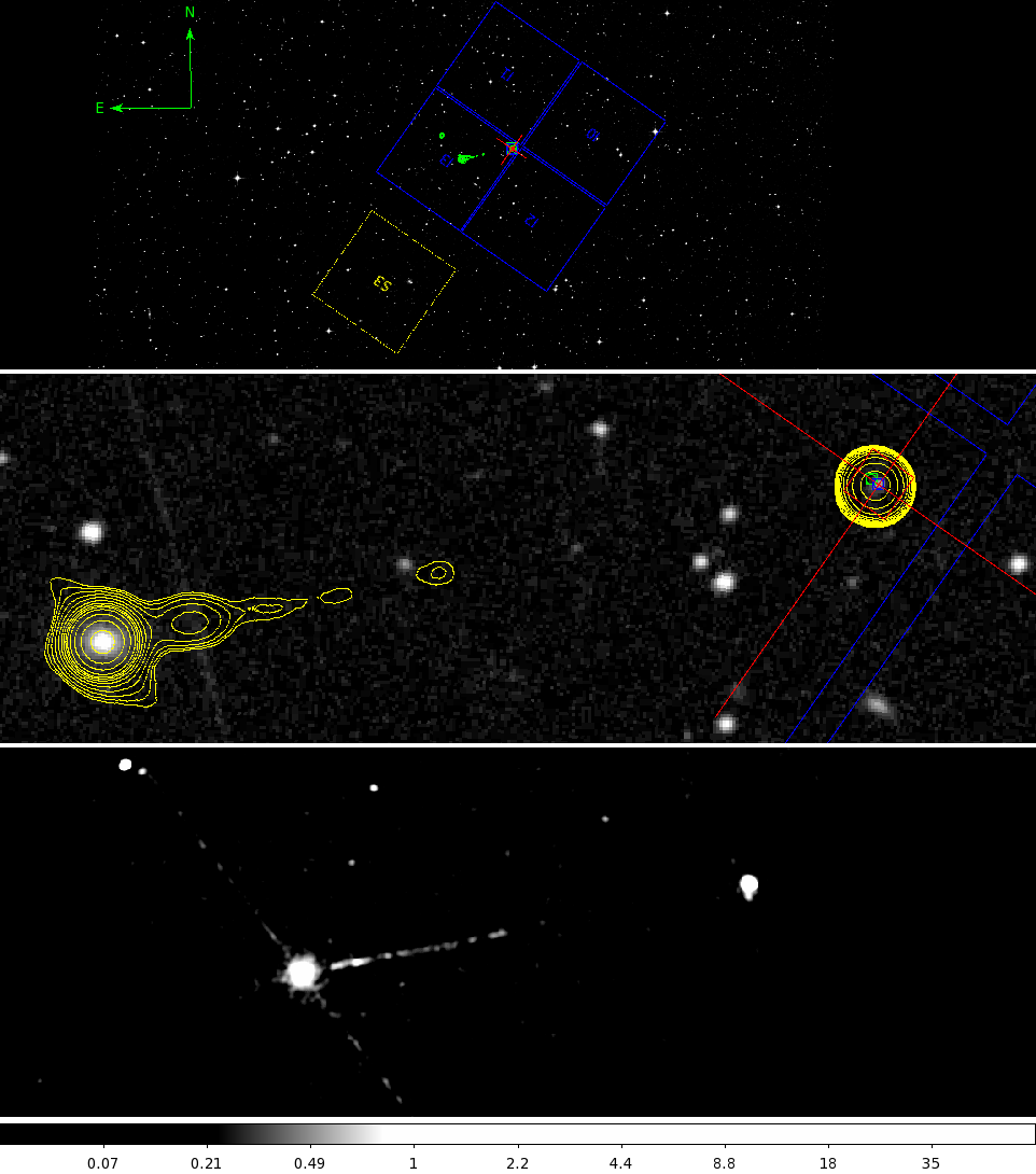 Center Panel: Zooming in on Pictor A from the Upper Panel. The crosshair (red) and optical-axis (blue) centered on the jet lobe and the nominal aimpoint (green) is illustrated. X-ray contour (yellow) are overlaid to assist visualization.
