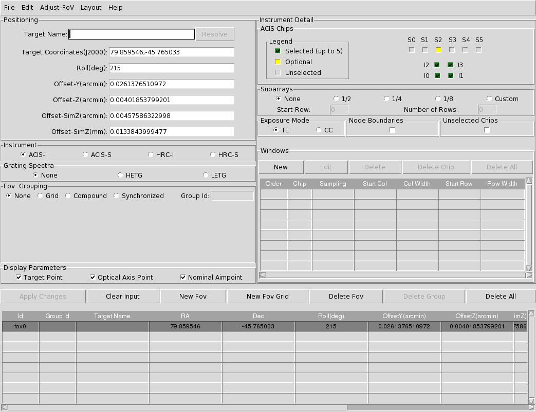 From the ObsVis GUI, the useful values—besides the target coordinates—for our needs are the Roll(deg) = 215 and Offset-SimZ(mm) = 0.0133843999477 fields, which will be incorporated into the MARX simulation. The nominal aimpoint position can be now obtained by selecting the Adjust-FoV → OffsetSimZ menu in the ObsVis GUI, and then Region → Get Information menu in DS9, to obtain RA = 05:19:26.416 [79.860065 deg] and Dec = -45:45:53.25 [-45.76479 deg].