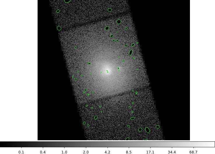 The resulting image is shown in Figure 3 with the source regions drawn for reference. The point sources have now been removed from the dataset.