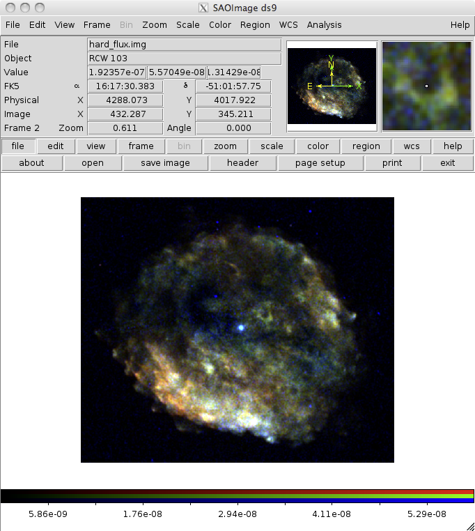 unix% ds9 -scale log -zoom 2 -cmap b rcw103/broad_flux.img