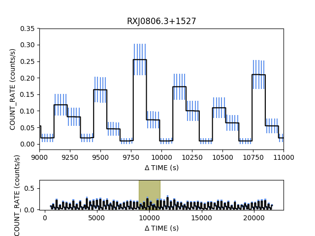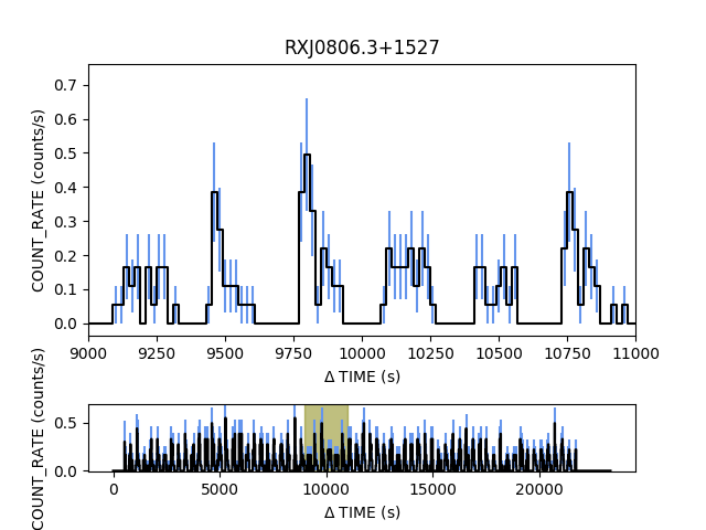 from pycrates import read_file import matplotlib.pylab as plt tab = read_file("RXJ0806.3+1527.lc") x = tab.get_column("dt").values y = tab.get_column("count_rate").values ye = tab.get_column("count_rate_err").values grid = plt.GridSpec(6,1,wspace=0.0, hspace=0.0) plt.subplot(grid[0:4,0]) plt.errorbar( x, y, yerr=ye, color="black", marker="None", ecolor="cornflowerblue", drawstyle="steps-mid") plt.xlim(9000,11000) plt.ylabel("COUNT_RATE (counts/s)") plt.xlabel(r"$\Delta$ TIME (s)") plt.title("RXJ0806.3+1527") plt.subplot(grid[5,0]) plt.errorbar( x, y, yerr=ye, color="black", marker="None", ecolor="cornflowerblue", drawstyle="steps-mid") plt.fill([9000,11000,11000,9000],[-1,-1,1,1],color="olive", alpha=0.5) plt.ylim(-0.01, 0.7) plt.ylabel("COUNT_RATE (counts/s)") plt.xlabel(r"$\Delta$ TIME (s)") plt.show()