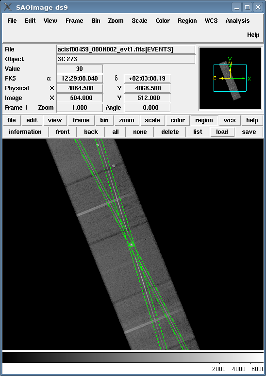 The region file, acis_459_evt1_L1a.fits, will be used to mask the event file. The regions may be viewed over the event file using ds9: