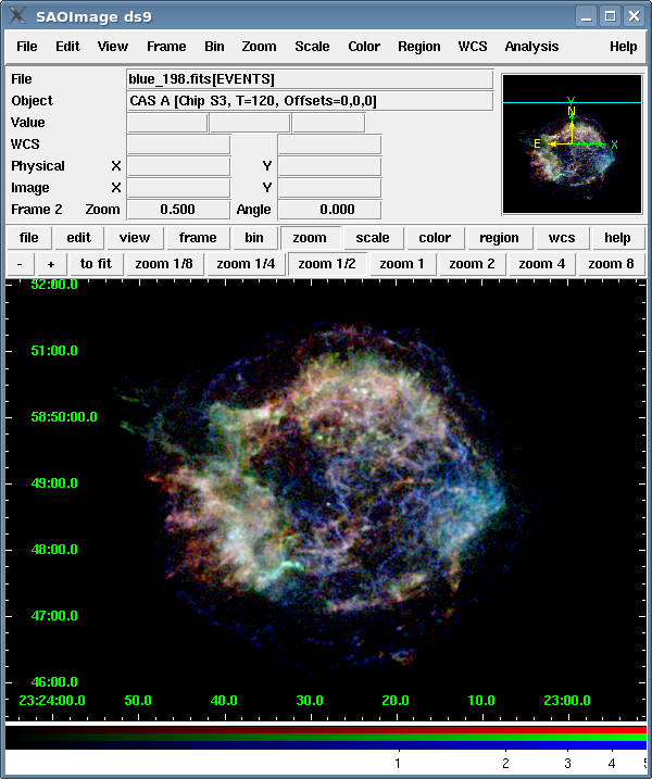 ds9 will open with the three files in one frame, as shown in Figure 1; the "Scale" is set to "log: minmax". The RGB window (Figure 2) should open as well. If it doesn't, open it from the "Frame → RGB..." menu.