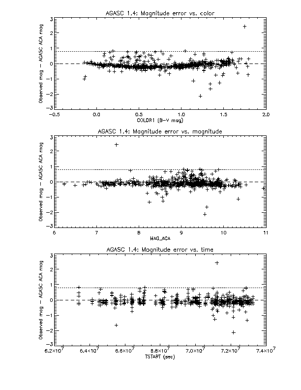 The plots below show the magnitude error (observed magnitude - AGASC magnitude) versus three independent variables: color (B-V), AGASC magnitude, and time. In each case I also plot a line corresponding to zero error and a 0.8 mag error. The latter quantity corresponds roughly to the systematic error used in the MAY1000 and MAY1400 loads.