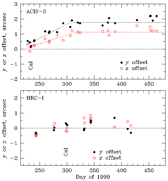 Dotted lines in the ACIS-S panel show the presently adopted