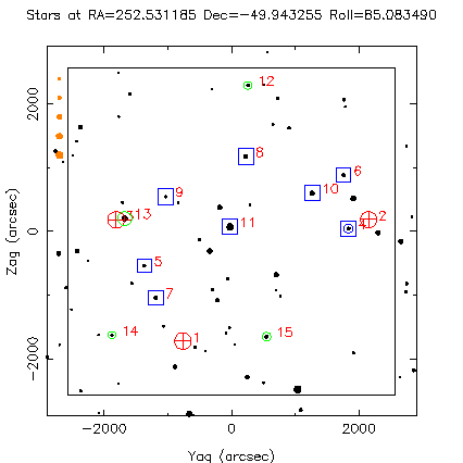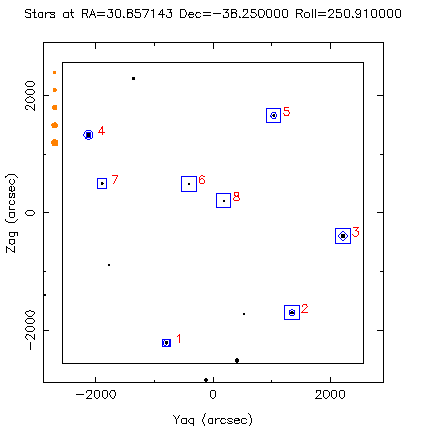 OBSID: 61285 RA, Dec, Roll (deg): 30.857143 -38.250000 250.910000 BACKSTOP GUIDE_SUMM OR MANVR DOT MAKE_STARS MP_TARGQUAT at 2002:057:20:01:37.620 (VCDU count = 14546099) Q1,Q2,Q3,Q4: -0.79243663 -0.02154759 0.40306143 0.45729790 MANVR: Angle= 0.03 deg Duration= 240 sec Slew err= 30.0 arcsec MP_STARCAT at 2002:057:20:01:39.263 (VCDU count = 14546105) ---------------------------------------------------------------------------------------- IDX SLOT ID TYPE SZ MINMAG MAG MAXMAG YANG ZANG DIM RES HALFW NOTES ---------------------------------------------------------------------------------------- [ 1] 0 989594656 BOT 6x6 5.797 9.810 10.609 -789 -2215 9 1 65 [ 2] 1 989594688 BOT 6x6 5.797 10.031 10.812 1347 -1701 20 1 120 [ 3] 2 989594792 BOT 6x6 5.797 9.281 10.062 2217 -392 20 1 120 [ 4] 3 989596008 BOT 6x6 5.797 9.016 9.797 -2124 1332 4 1 40 [ 5] 4 989598360 BOT 6x6 5.797 10.118 10.906 1036 1662 20 1 120 [ 6] 5 989598728 ACQ 6x6 5.797 10.673 11.484 -409 494 20 1 120 [ 7] 6 989595848 ACQ 6x6 5.797 10.307 11.094 -1890 506 12 1 80 [ 8] 7 989598656 ACQ 6x6 5.797 10.897 11.719 186 207 20 1 120 >> WARNING: Magnitude. [ 8]: 10.897 >> WARNING: Magnitude. [ 6]: 10.673 >> WARNING: Magnitude. [ 7]: 10.307