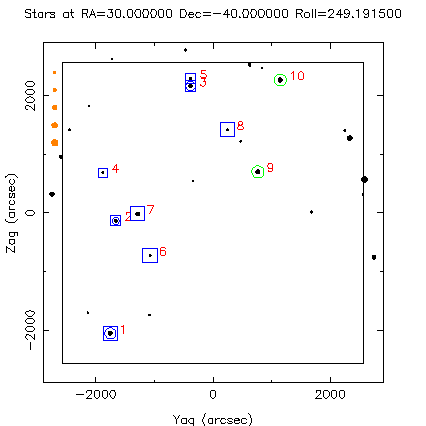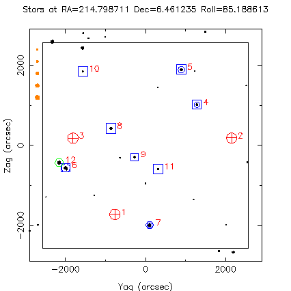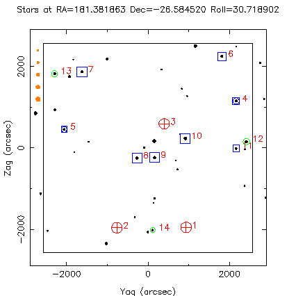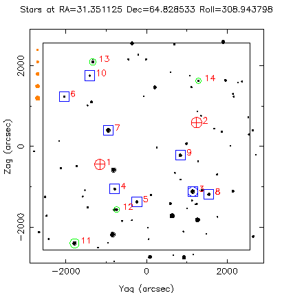OBSID: 61282 RA, Dec, Roll (deg): 30.000000 -40.000000 249.191500 BACKSTOP GUIDE_SUMM OR MANVR DOT MAKE_STARS MP_TARGQUAT at 2002:057:21:08:37.620 (VCDU count = 14561786) Q1,Q2,Q3,Q4: -0.79743807 -0.01262938 0.41004088 0.44249237 MANVR: Angle= 2.21 deg Duration= 333 sec Slew err= 31.1 arcsec MP_STARCAT at 2002:057:21:08:39.263 (VCDU count = 14561793) ---------------------------------------------------------------------------------------- IDX SLOT ID TYPE SZ MINMAG MAG MAXMAG YANG ZANG DIM RES HALFW NOTES ---------------------------------------------------------------------------------------- [ 1] 0 988682568 BOT 6x6 5.797 8.341 9.125 -1754 -2054 20 1 120 [ 2] 1 989594176 BOT 6x6 5.797 9.631 10.422 -1659 -133 13 1 85 [ 3] 2 989992856 BOT 6x6 5.797 8.834 9.641 -384 2164 14 1 90 [ 4] 3 989594120 ACQ 6x6 5.797 10.129 10.906 -1878 687 11 1 75 [ 5] 4 989995000 ACQ 6x6 5.797 9.918 10.703 -380 2294 14 1 90 [ 6] 5 988683608 ACQ 6x6 5.797 10.155 10.938 -1074 -723 20 1 120 [ 7] 6 989594040 ACQ 6x6 5.797 8.776 9.562 -1284 -16 20 1 120 [ 8] 7 989990704 ACQ 6x6 5.797 9.987 10.781 250 1418 20 1 120 [ 9] 3 989992312 GUI 6x6 5.797 7.991 8.781 763 705 1 1 25 [10] 4 989990288 GUI 6x6 5.797 8.108 8.891 1147 2270 1 1 25 >> WARNING: Search Box Overlap. [ 3]-[ 5]: Y,Z,Mag Overlaps: 176.6 49.9 3.844 >> WARNING: Quadrant Boundary. [ 7]