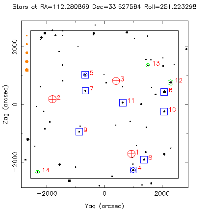 OBSID: 61281 RA, Dec, Roll (deg): 31.000000 64.000000 309.032079 BACKSTOP GUIDE_SUMM OR MANVR DOT MAKE_STARS MP_TARGQUAT at 2002:058:02:38:43.243 (VCDU count = 14639077) Q1,Q2,Q3,Q4: -0.22377284 -0.55847329 -0.01512877 0.79862658 MANVR: Angle= 115.63 deg Duration= 2202 sec Slew err= 87.8 arcsec MP_STARCAT at 2002:058:02:38:44.886 (VCDU count = 14639083) ---------------------------------------------------------------------------------------- IDX SLOT ID TYPE SZ MINMAG MAG MAXMAG YANG ZANG DIM RES HALFW NOTES ---------------------------------------------------------------------------------------- [ 1] 0 529673088 BOT 6x6 5.797 8.920 9.703 -2213 922 16 1 100 [ 2] 1 529668504 ACQ 6x6 5.797 7.637 9.016 -1037 -449 20 1 120 [ 3] 2 529675904 ACQ 6x6 5.797 7.380 8.156 -827 1184 20 1 120 [ 4] 3 529673256 ACQ 6x6 5.797 8.595 9.375 -427 1116 16 1 100 [ 5] 4 529667744 ACQ 6x6 5.797 6.568 7.359 -708 483 20 1 120 [ 6] 5 529670480 ACQ 6x6 5.797 9.309 10.844 -1382 882 20 1 120 [ 7] 6 529673648 ACQ 6x6 5.797 9.345 10.453 55 -1307 20 1 120 [ 8] 7 529672264 ACQ 6x6 5.797 9.505 10.312 674 75 20 1 120 [ 9] 1 529148048 GUI 6x6 5.797 9.521 10.344 1656 -2441 1 1 25 [10] 2 529138464 GUI 6x6 5.797 8.143 8.938 1220 -111 1 1 25 [11] 3 529670336 GUI 6x6 5.797 8.533 9.312 -1138 2083 1 1 25 [12] 4 529669872 GUI 6x6 5.797 9.655 10.531 1162 1112 1 1 25 >> WARNING: Quadrant Boundary. [ 7]