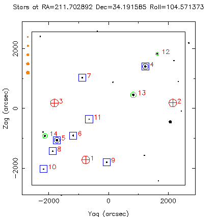 OBSID: 3207 3C294 ACIS-S SIM Z offset: 0 Grating: NONE RA, Dec, Roll (deg): 211.702825 34.192118 106.501404 Dither: ON Y_amp= 8.0 Z_amp= 8.0 Y_period=1000.0 Z_period= 707.1 BACKSTOP GUIDE_SUMM OR MANVR DOT MAKE_STARS MP_TARGQUAT at 2002:058:14:35:49.965 (VCDU count = 14806986) Q1,Q2,Q3,Q4: 0.03998779 -0.78477606 -0.48579150 0.38279777 MANVR: Angle= 83.41 deg Duration= 1772 sec Slew err= 71.7 arcsec MP_STARCAT at 2002:058:14:35:51.608 (VCDU count = 14806992) ---------------------------------------------------------------------------------------- IDX SLOT ID TYPE SZ MINMAG MAG MAXMAG YANG ZANG DIM RES HALFW NOTES ---------------------------------------------------------------------------------------- [ 1] 0 2 FID 8x8 5.797 7.000 8.000 -760 -1730 1 1 25 [ 2] 1 4 FID 8x8 5.797 7.000 8.000 2151 178 1 1 25 [ 3] 2 5 FID 8x8 5.797 7.000 8.000 -1813 172 1 1 25 [ 4] 3 333972640 BOT 6x6 5.797 8.227 9.016 843 429 18 1 110 [ 5] 4 333973208 BOT 6x6 5.797 8.398 9.188 1275 1365 20 1 120 [ 6] 5 333973608 BOT 6x6 5.797 9.982 10.797 1692 1773 20 1 120 [ 7] 6 333977144 BOT 6x6 5.797 8.388 9.172 -1765 -999 20 1 120 [ 8] 7 333972048 ACQ 6x6 5.797 9.890 10.672 -1212 -864 20 1 120 [ 9] 0 333973304 ACQ 6x6 5.797 10.247 11.047 -842 1058 20 1 120 [10] 1 333971824 ACQ 6x6 5.797 10.331 11.125 -1917 -1364 20 1 120 [11] 2 333979096 ACQ 6x6 5.797 10.456 11.266 -120 -1794 20 1 120 [12] 7 333978704 GUI 6x6 5.797 8.911 9.703 -2159 -843 1 1 25 >> WARNING: Magnitude. [ 9]: 10.247 >> WARNING: Magnitude. [10]: 10.331 >> WARNING: Magnitude. [11]: 10.456 >> WARNING: Search spoiler. [11]- 333978856: Y,Z,Radial,Mag seps: 163 131 209 -0.7