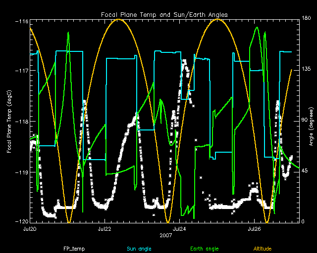 Min/max envelopes in dark blue appear on the trending plots. The envelopes are 4th degree fits to the monthly minimum and maximum values for each MSID. The final polynomial form and binning are still being experimented with. We will soon add to the trending pages a report of the fits and predictions they give on future limit violations. The light blue curve is our original smoothing of all the data over 30 day moving boxcars. The green/yellow line is a linear fit to all the data; the break occurs at a limit change.