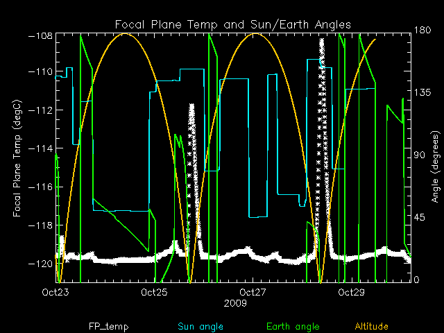 Weekly focal plane temperature with sun angle, earth angle, and altitude overplotted. Sun angle is the solar array angle, that is the angle between the sun and the optical axis (+X axis). The earth angle is the angle between earth and the ACIS radiator (+Z axis). Altitude varies from 34 kkm to 128 kkm.
