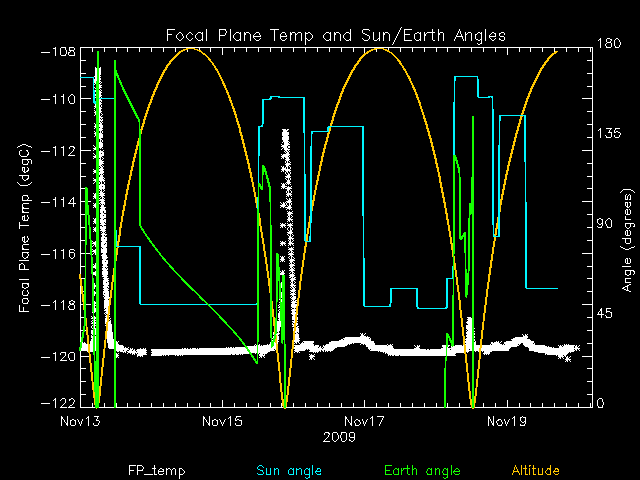 Weekly focal plane temperature with sun angle, earth angle, and altitude overplotted. Sun angle is the solar array angle, that is the angle between the sun and the optical axis (+X axis). The earth angle is the angle between earth and the ACIS radiator (+Z axis). Altitude varies from 34 kkm to 128 kkm.