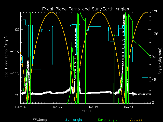 Weekly focal plane temperature with sun angle, earth angle, and altitude overplotted. Sun angle is the solar array angle, that is the angle between the sun and the optical axis (+X axis). The earth angle is the angle between earth and the ACIS radiator (+Z axis). Altitude varies from 34 kkm to 128 kkm.
