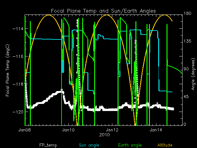 Weekly focal plane temperature with sun angle, earth angle, and altitude overplotted. Sun angle is the solar array angle, that is the angle between the sun and the optical axis (+X axis). The earth angle is the angle between earth and the ACIS radiator (+Z axis). Altitude varies from 34 kkm to 128 kkm.