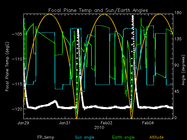 Weekly focal plane temperature with sun angle, earth angle, and altitude overplotted. Sun angle is the solar array angle, that is the angle between the sun and the optical axis (+X axis). The earth angle is the angle between earth and the ACIS radiator (+Z axis). Altitude varies from 34 kkm to 128 kkm.