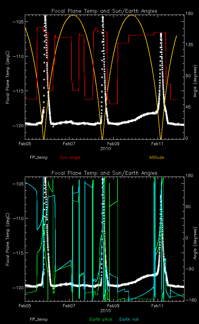 Weekly focal plane temperature with sun angle, earth angle, and altitude overplotted. Sun angle is the solar array angle, that is the angle between the sun and the optical axis (+X axis). The earth angle is the angle between earth and the ACIS radiator in the roll and pitch planes. Altitude varies from 34 kkm to 128 kkm.