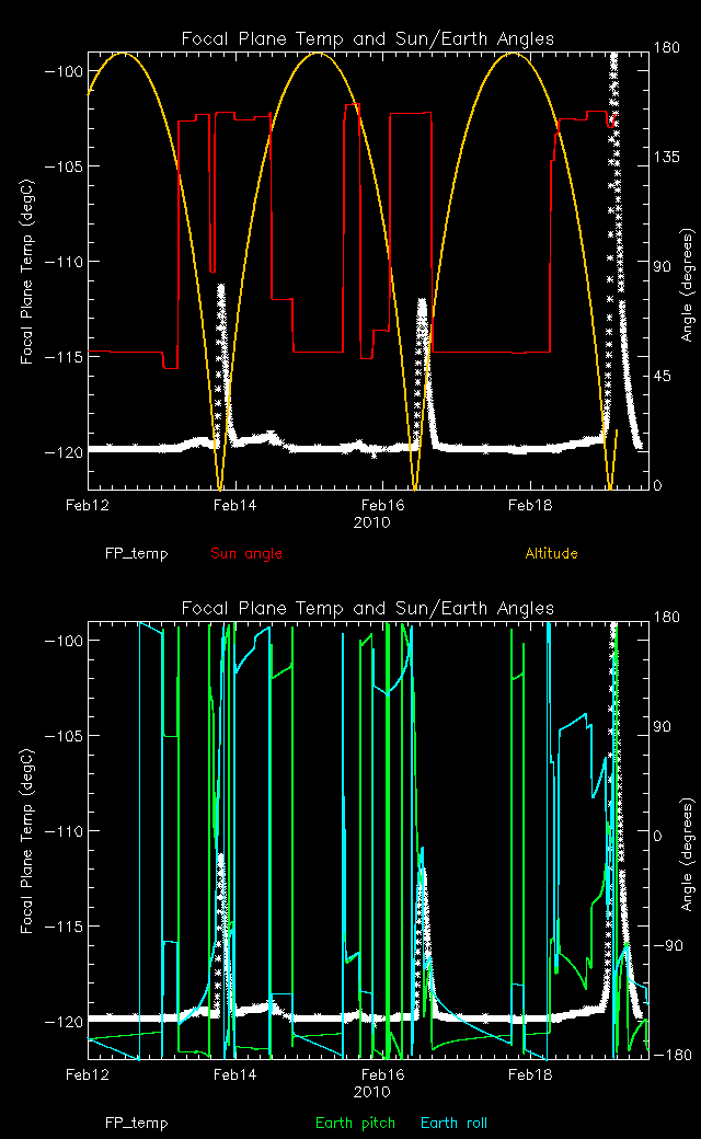 Weekly focal plane temperature with sun angle, earth angle, and altitude overplotted. Sun angle is the solar array angle, that is the angle between the sun and the optical axis (+X axis). The earth angle is the angle between earth and the ACIS radiator in the roll and pitch planes. Altitude varies from 34 kkm to 128 kkm.