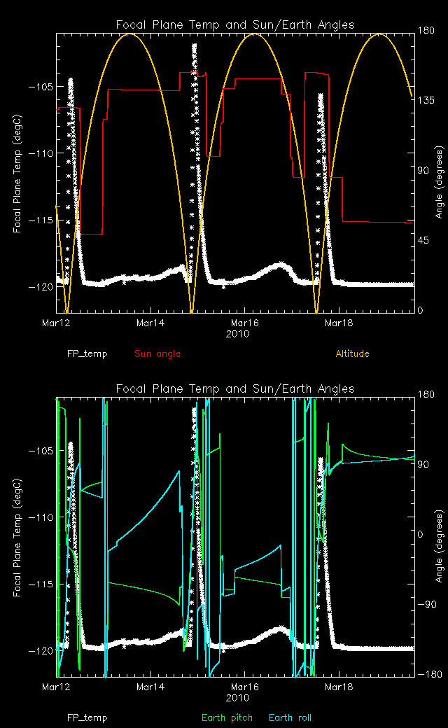 Weekly focal plane temperature with sun angle, earth angle, and altitude overplotted. Sun angle is the solar array angle, that is the angle between the sun and the optical axis (+X axis). The earth angle is the angle between earth and the ACIS radiator (+Z axis). Altitude varies from 34 kkm to 128 kkm.