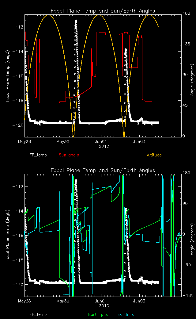 Weekly focal plane temperature with sun angle, earth angle, and altitude overplotted. Sun angle is the solar array angle, that is the angle between the sun and the optical axis (+X axis). The earth angle is the angle between earth and the ACIS radiator (+Z axis). Altitude varies from 34 kkm to 128 kkm.