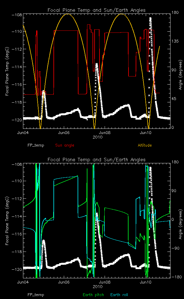 Weekly focal plane temperature with sun angle, earth angle, and altitude overplotted. Sun angle is the solar array angle, that is the angle between the sun and the optical axis (+X axis). The earth angle is the angle between earth and the ACIS radiator (+Z axis). Altitude varies from 34 kkm to 128 kkm.