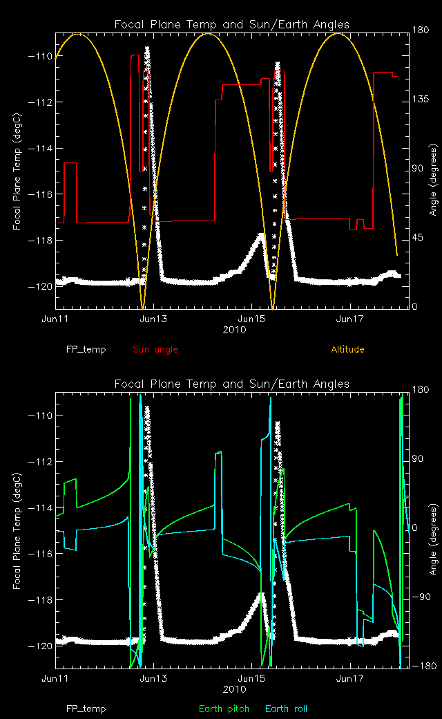 Weekly focal plane temperature with sun angle, earth angle, and altitude overplotted. Sun angle is the solar array angle, that is the angle between the sun and the optical axis (+X axis). The earth angle is the angle between earth and the ACIS radiator (+Z axis). Altitude varies from 34 kkm to 128 kkm.