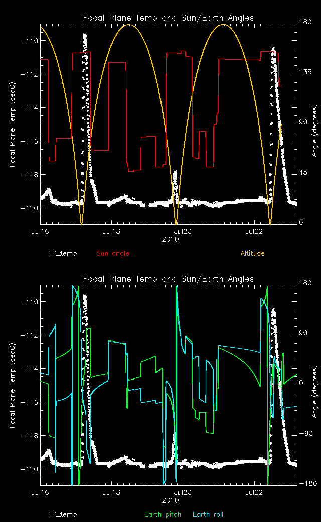 Weekly focal plane temperature with sun angle, earth angle, and altitude overplotted. Sun angle is the solar array angle, that is the angle between the sun and the optical axis (+X axis). The earth angle is the angle between earth and the ACIS radiator (+Z axis). Altitude varies from 34 kkm to 128 kkm.