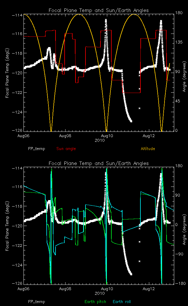 Weekly focal plane temperature with sun angle, earth angle, and altitude overplotted. Sun angle is the solar array angle, that is the angle between the sun and the optical axis (+X axis). The earth angle is the angle between earth and the ACIS radiator (+Z axis). Altitude varies from 34 kkm to 128 kkm.