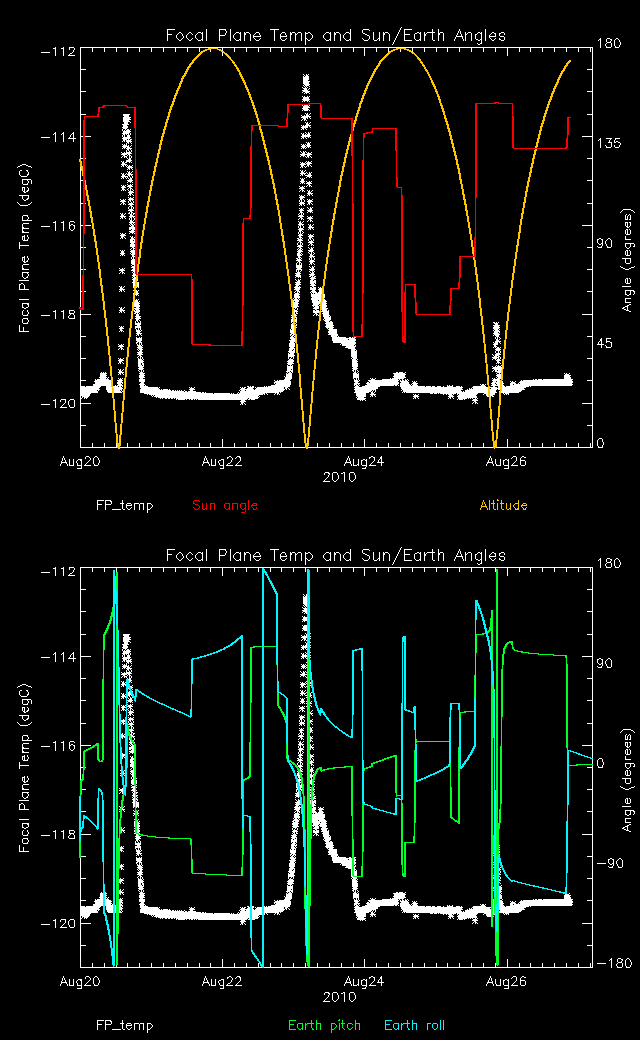 Weekly focal plane temperature with sun angle, earth angle, and altitude overplotted. Sun angle is the solar array angle, that is the angle between the sun and the optical axis (+X axis). The earth angle is the angle between earth and the ACIS radiator (+Z axis). Altitude varies from 34 kkm to 128 kkm.