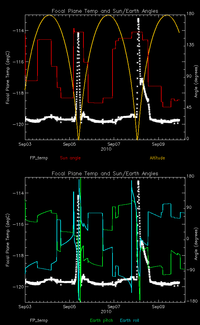 Weekly focal plane temperature with sun angle, earth angle, and altitude overplotted. Sun angle is the solar array angle, that is the angle between the sun and the optical axis (+X axis). The earth angle is the angle between earth and the ACIS radiator (+Z axis). Altitude varies from 34 kkm to 128 kkm.