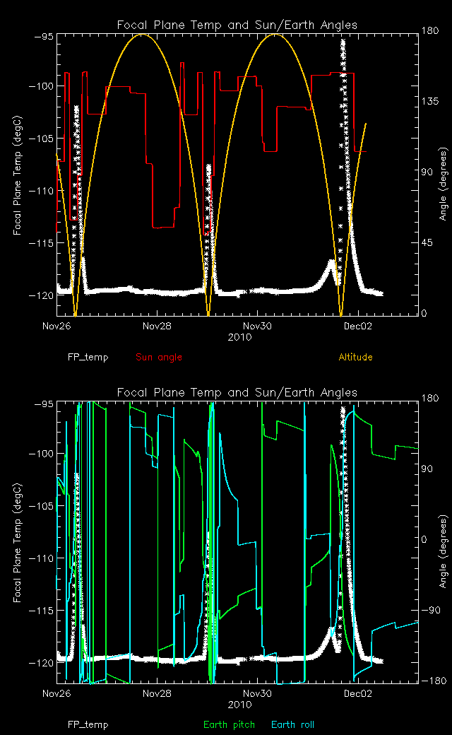 Weekly focal plane temperature with sun angle, earth angle, and altitude overplotted. Sun angle is the solar array angle, that is the angle between the sun and the optical axis (+X axis). The earth angle is the angle between earth and the ACIS radiator (+Z axis). Altitude varies from 34 kkm to 128 kkm.