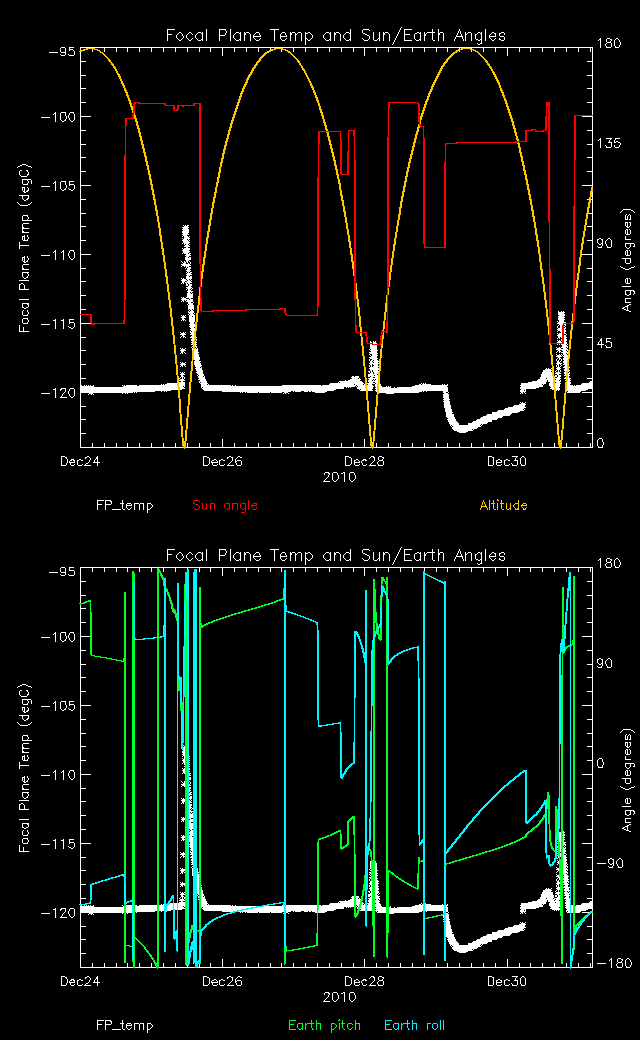 Weekly focal plane temperature with sun angle, earth angle, and altitude overplotted. Sun angle is the solar array angle, that is the angle between the sun and the optical axis (+X axis). The earth angle is the angle between earth and the ACIS radiator (+Z axis). Altitude varies from 34 kkm to 128 kkm.