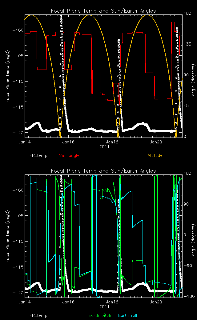Weekly focal plane temperature with sun angle, earth angle, and altitude overplotted. Sun angle is the solar array angle, that is the angle between the sun and the optical axis (+X axis). The earth angle is the angle between earth and the ACIS radiator (+Z axis). Altitude varies from 34 kkm to 128 kkm.
