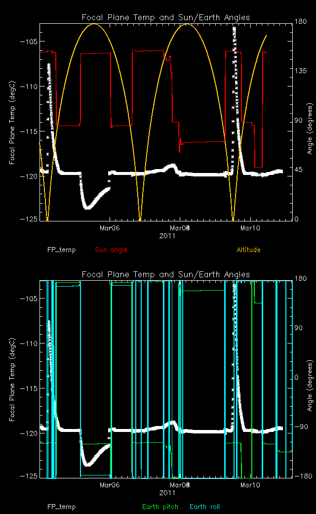 Weekly focal plane temperature with sun angle, earth angle, and altitude overplotted. Sun angle is the solar array angle, that is the angle between the sun and the optical axis (+X axis). The earth angle is the angle between earth and the ACIS radiator (+Z axis). Altitude varies from 34 kkm to 128 kkm.