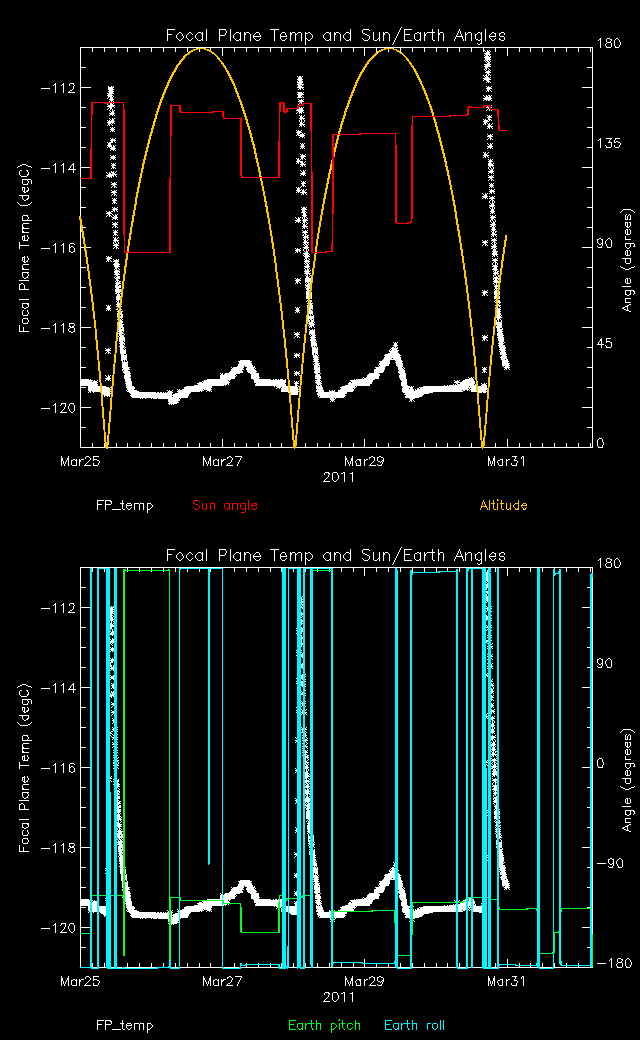 Weekly focal plane temperature with sun angle, earth angle, and altitude overplotted. Sun angle is the solar array angle, that is the angle between the sun and the optical axis (+X axis). The earth angle is the angle between earth and the ACIS radiator (+Z axis). Altitude varies from 34 kkm to 128 kkm.