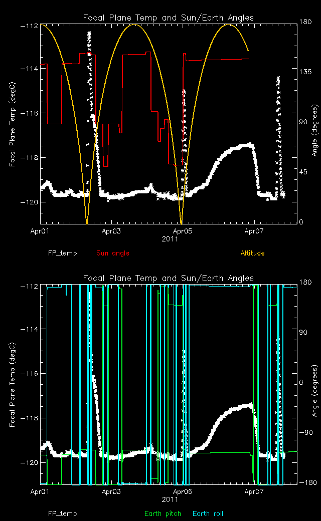 Weekly focal plane temperature with sun angle, earth angle, and altitude overplotted. Sun angle is the solar array angle, that is the angle between the sun and the optical axis (+X axis). The earth angle is the angle between earth and the ACIS radiator (+Z axis). Altitude varies from 34 kkm to 128 kkm.
