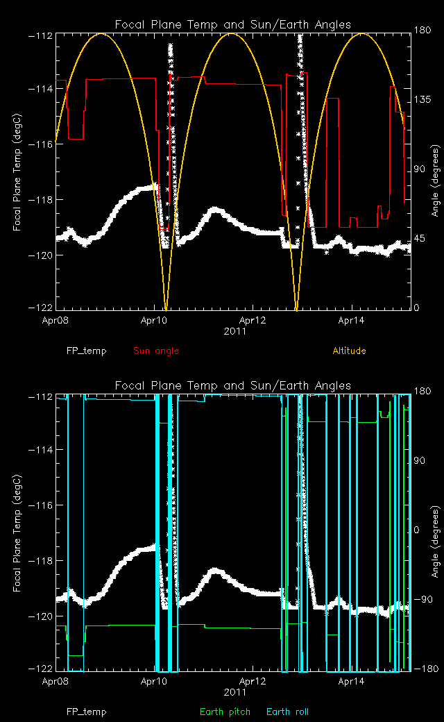 Weekly focal plane temperature with sun angle, earth angle, and altitude overplotted. Sun angle is the solar array angle, that is the angle between the sun and the optical axis (+X axis). The earth angle is the angle between earth and the ACIS radiator (+Z axis). Altitude varies from 34 kkm to 128 kkm.