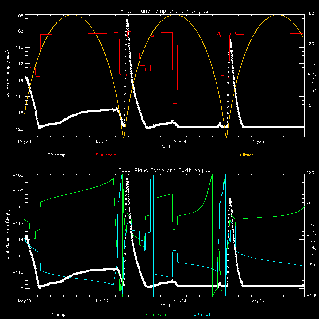 Weekly focal plane temperature with sun angle, earth angle, and altitude overplotted. Sun angle is the solar array angle, that is the angle between the sun and the optical axis (+X axis). The earth angle is the angle between earth and the ACIS radiator (+Z axis). Altitude varies from 34 kkm to 128 kkm.