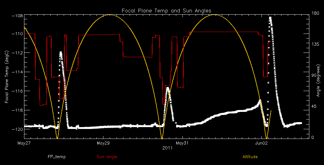Weekly focal plane temperature with sun angle, earth angle, and altitude overplotted. Sun angle is the solar array angle, that is the angle between the sun and the optical axis (+X axis). The earth angle is the angle between earth and the ACIS radiator (+Z axis). Altitude varies from 34 kkm to 128 kkm.