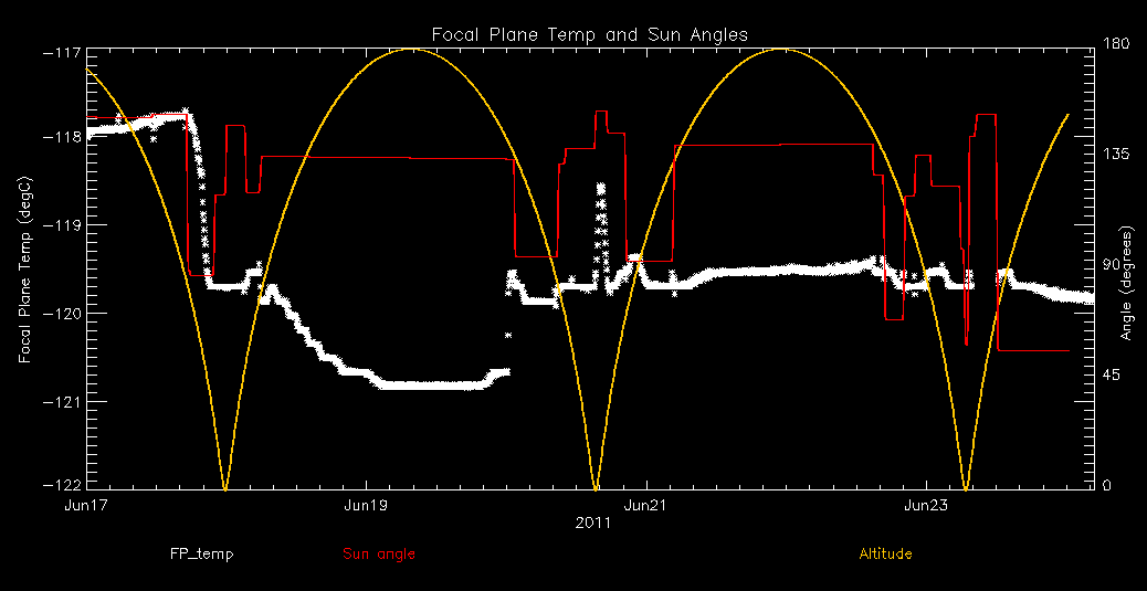 Weekly focal plane temperature with sun angle and altitude overplotted. Sun angle is the solar array angle, that is the angle between the sun and the optical axis (+X axis). Altitude varies from 34 kkm to 128 kkm.