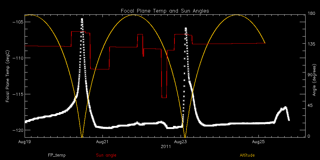 Weekly focal plane temperature with sun angle, earth angle, and altitude overplotted. Sun angle is the solar array angle, that is the angle between the sun and the optical axis (+X axis). The earth angle is the angle between earth and the ACIS radiator (+Z axis). Altitude varies from 34 kkm to 128 kkm.