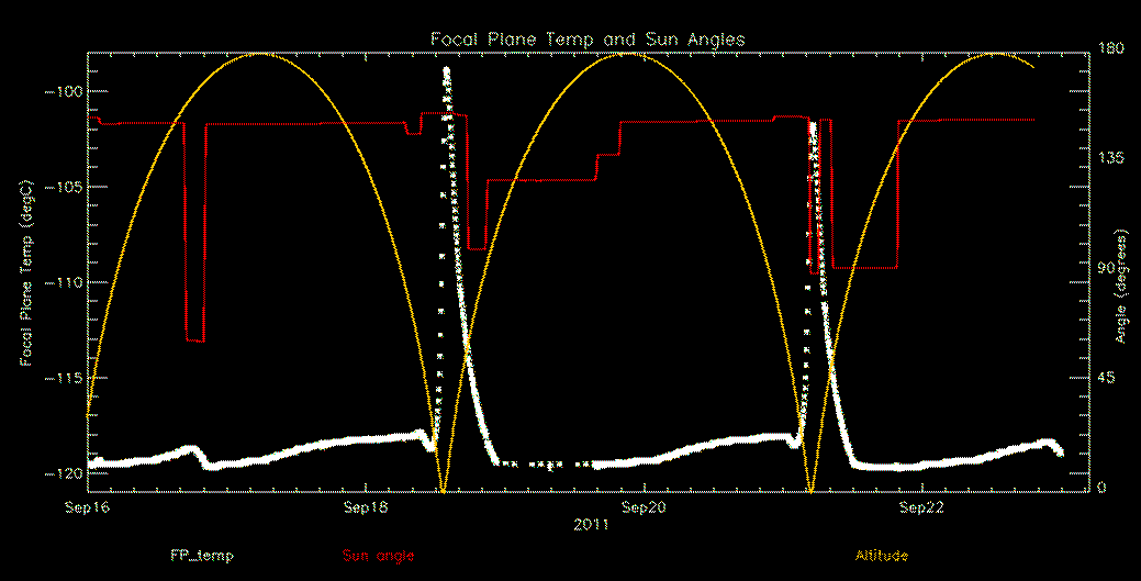 Weekly focal plane temperature with sun angle, earth angle, and altitude overplotted. Sun angle is the solar array angle, that is the angle between the sun and the optical axis (+X axis). The earth angle is the angle between earth and the ACIS radiator (+Z axis). Altitude varies from 34 kkm to 128 kkm.