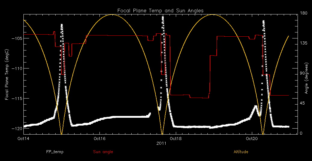 Weekly focal plane temperature with sun angle, earth angle, and altitude overplotted. Sun angle is the solar array angle, that is the angle between the sun and the optical axis (+X axis). The earth angle is the angle between earth and the ACIS radiator (+Z axis). Altitude varies from 34 kkm to 128 kkm.