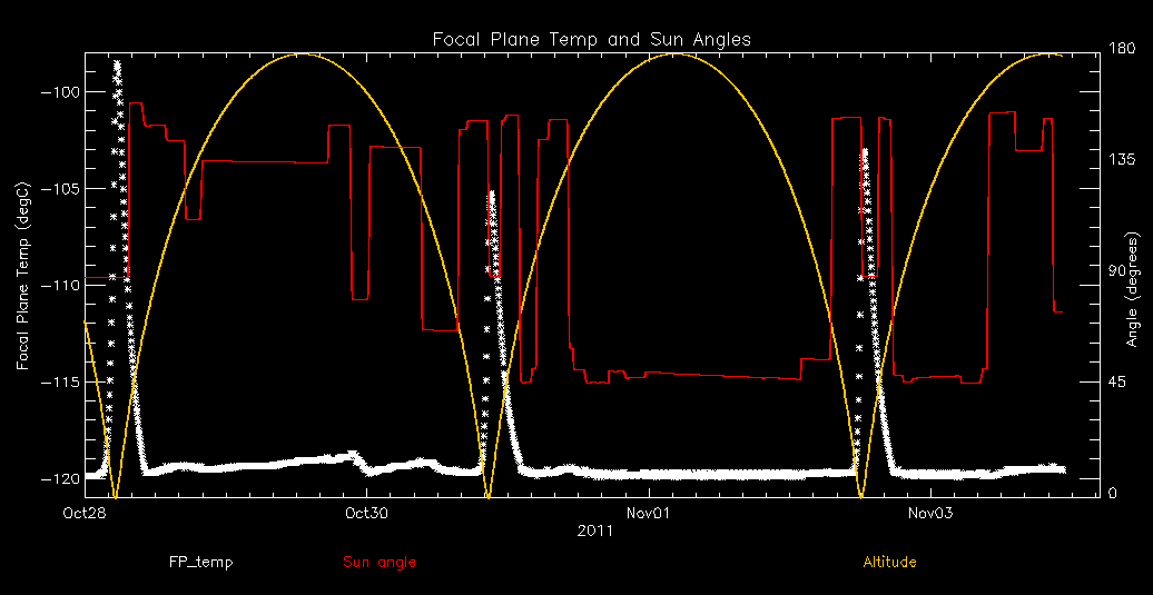 Weekly focal plane temperature with sun angle, earth angle, and altitude overplotted. Sun angle is the solar array angle, that is the angle between the sun and the optical axis (+X axis). The earth angle is the angle between earth and the ACIS radiator (+Z axis). Altitude varies from 34 kkm to 128 kkm.